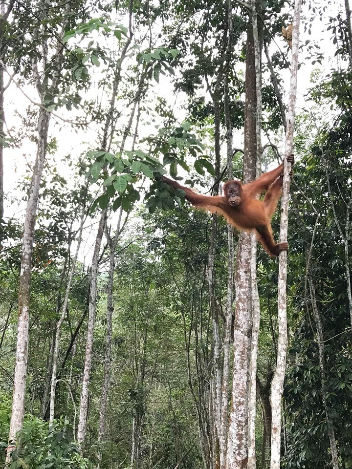 I had a lazy Saturday morning, doing my washing and then reading in our back yard for a while. At about 1pm our new volunteer arrived and so after giving her time to nap and unpack we headed into town on the bike! We have a policy here not to let our volunteers drive motorised vehicles – for both safety and conservation reasons, but I did feel a little daunted and embarrassed to be driving her round having discovered she drives a vesper at home in Germany! She was very polite about the bumps and wobbles en route however and we made it to town in one piece. We had a wander round the centre before heading to the river for a paddle. We had intended to swim but the current had other ideas. Then we sat on the riverbank for a while, watching the monkeys. Here we saw an Asian water monitor, which at first I thought was a crocodile! We then headed to the edge of the Jungle where we were lucky enough to see two orangutans thanks to a local man showing us where they were nesting. It was incredible so see a baby orangutan up close, but also fairly bittersweet for a first sighting, as I’m sure the man who showed us them must have been feeding them as they were keen to come towards him. Feeding orangutans can pass human diseases on to them and is something we at the Trust really try to discourage local people and guides from doing. After a meal we headed back to the Trust for an early night, only to discover that the headlight on the bike has given up. Every day we have a new problem to solve!